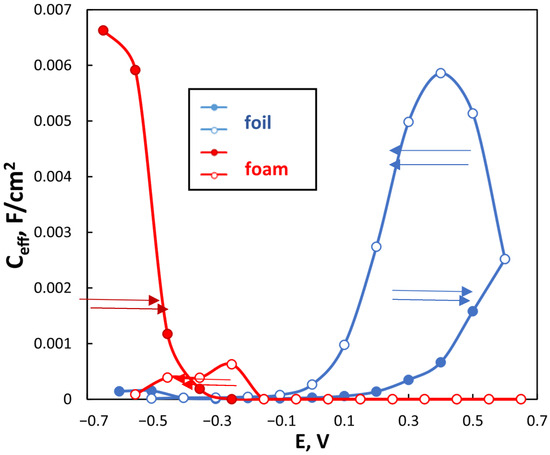 The effective capacitance of the double electric layer extracted from EIS spectra obtained on foil (blue) and foam (red) electrodes; arrows show a potential scan direction. The values of constant phase elements were recalculated into effective capacity using a relationship derived for faradaic systems [35].