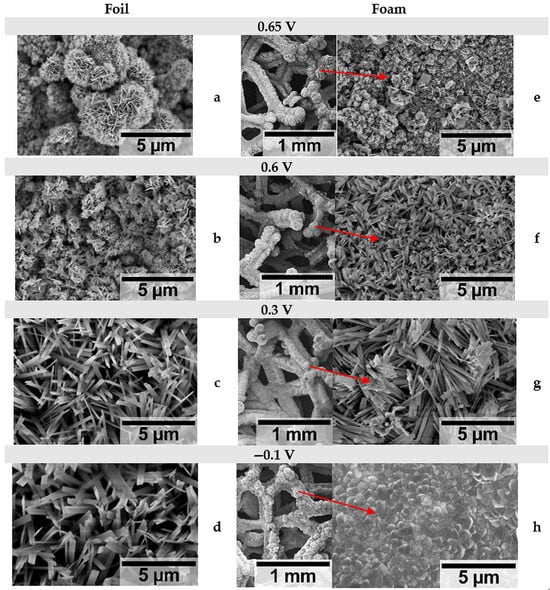 Similar nanoplatelet and nanoneedle surface morphologies also dominate on foam electrodes (Figure 6e–g). However, due to the 3D framework and many zones of potentially different local current densities, several distinct types of nanostructures can be observed on these electrodes. Moreover, when the upper vertex potential was set to −0.1 V, a compact layer covering copper foam was formed (Figure 6h). Furthermore, low magnification SEM images of the foam electrodes (Figure 6e–h) show that the formed structures at −0.1 V grow preferentially in the middle of the strut (Figure 6h), while at higher anodic potentials the edges are more roofed (Figure 6e–h). Furthermore, in all cases, the films grown on 3D electrodes are less powdery and have better adhesion to the substrate.
