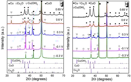 XRD diffractograms of copper oxide and hydroxide films, obtained through cyclic voltammetry after 1000 cycles at various upper vertex potentials on Cu foil (a) and foam (b) substrates. The peaks of the films are compared to Cu2O, CuO, and Cu(OH)2, cards ICDD # 00-005-0667, ICDD # 00-005-0661, and ICDD # 00-003-0310, respectively.