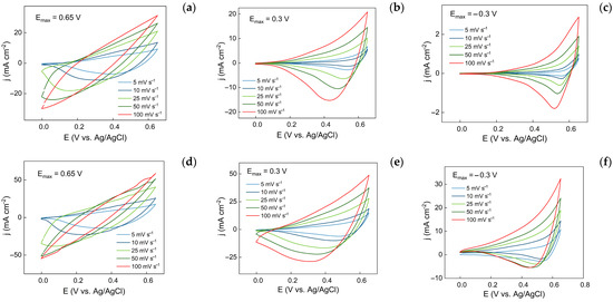 Cyclic voltammetry curves showcasing the pseudocapacitive behaviour of nanostructured copper oxide-based films, synthesized on copper foil (a–c) and foam (d–f) electrodes at different upper vertex potentials (Emax) and scan rates.