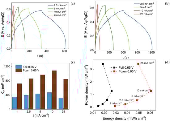 The films exhibiting the highest specific capacitances and apparent reversibility were further characterized by analysing galvanostatic charge–discharge cycles at different current densities. When comparing the GCD curves of foil and foam electrodes (Figure 10a,b), it is evident that both the charging and discharging processes take more time on the foam electrodes at the same current densities. Accordingly, the specific capacitances of foam electrodes are larger than those of foil electrodes (Figure 10c), correlating well to the results obtained from CV experiments. The largest specific capacitances obtained from GCD curves were 1085 mF cm−2 and 471 mF cm−2 (on foam and foil electrodes, respectively), measured at 10 mA cm−2. When using a higher current density of 25 mA cm−2, the specific capacitance was found to drop. Similarly, to faster scan rates during CV experiments, larger charge/discharge current densities probably hinder the interaction of the electrolyte with the deeper layers of the nanostructured film, resulting in lower charging/discharging.