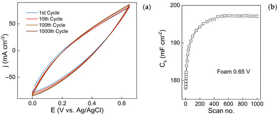 Characterization of capacitive stability of Cu foam electrode, synthesized to upper vertex potential of 0.65 V: CV scans obtained at 100 mV s−1 (a), change of Cs with the number of scans (b).