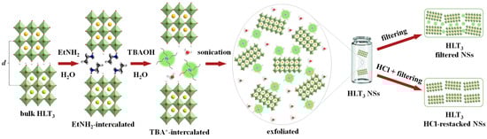Taking into account the data from our recent article [102], ethylamine-intercalated forms of the titanates HLT×EtNH2, HNT×EtNH2, HLT3×EtNH2 and HNT3×EtNH2 were used as precursors for the liquid-phase exfoliation into nanosheets. The detailed procedure for preparing the initial compounds is presented in Information S1. Briefly, alkaline layered perovskite-like titanates NaLnTiO4 and K2Ln2Ti3O10 (Ln = La, Nd) were synthesized via the conventional ceramic technique and then transformed into the corresponding protonated forms HLT (HNT) and HLT3 (HNT3) via the acid treatment that, in turn, were treated with aqueous ethylamine to produce the desired amine-intercalated derivatives.