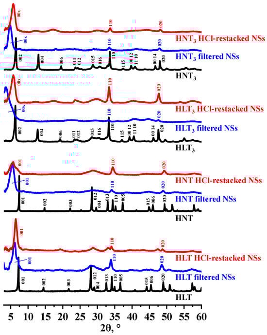 Primary characterization of the reassembled titanates was performed using powder XRD analysis (Figure 2, Table 1). As one can see from the patterns obtained, both forms of the reassembled nanosheets exhibit evident reflections (00x), corresponding to large interplanar distances between the stacked layers. Moreover, the samples preserve practically the same positions of (110) and (020) reflections as well as values of the a lattice parameter as their bulk precursors. At the same time, XRD patterns of the reassembled samples differ noticeably from those of the precursors in strong broadening of the diffraction maxima, which points to the expressed nanosheet stacking disorder. Thus, both simple filtration and restacking of the nanosheets by hydrochloric acid result in the assembly of the layered perovskite-like structure with lower orderliness than in the case of the initial protonated titanates. Meanwhile, all the reassembled samples show a pronounced low-angle shift in the (00x) reflections and, accordingly, possess greater interlayer distances d in comparison with those of the protonated precursors (Figure 2, Table 1). This observation points to the existence of some factors preventing the interlayer space from stronger contraction, such as potential interlayer embedding of TBA+ cations and water molecules. Moreover, it is important to notice that in the case of HLT3 and HNT3 titanates, filtered NSs are characterized by a more expanded interlayer space than their HCl-restacked counterparts.