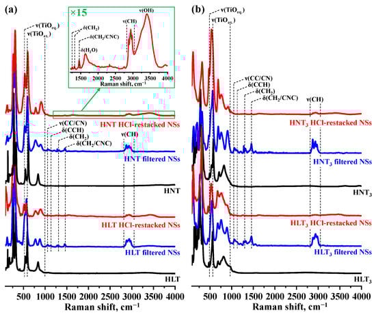 Raman spectra of the reassembled nanosheets (Figure 3) demonstrate immutability of most vibrational modes located in the titanium–oxygen octahedra (400–750 cm−1) and in the (LnO)2 layer (270–320 cm−1, for HLT and HNT only) once again indicating preservation of the perovskite structure upon exfoliation and reassembly. The main exception is the symmetric stretching mode of axial Ti–O bonds directed towards the ion-exchangeable interlayer space (≈835 cm−1 for HLT, HNT and ≈820 cm−1 for HLT3, HNT3) whose frequency is known to be sensitive to the interlayer composition. When going from the protonated titanates to their reassembled forms, the aforementioned band evidently splits into two new intense ones: ≈775 and ≈890 cm−1 for HLT (HNT) filtered NSs, ≈780 and ≈905 cm−1 for HLT (HNT) HCl-restacked NSs, ≈760 and ≈900 cm−1 for HLT3 (HNT3) filtered NSs and ≈765 and ≈910 cm−1 for HLT3 (HNT3) HCl-restacked NSs. Such splitting, apparently, should originate from some changes in the surrounding of the interlayer oxygen vertices of the terminal perovskite octahedra. Moreover, the foregoing split bands in the filtered NSs exhibit 5–15 cm−1 lower frequencies than in the HCl-restacked ones, which may point to stronger association of the oxygen vertices with the interlayer components. A similar splitting caused by the partial dissociation of interlayer hydroxyl groups of the oxide and subsequent protonation of amine molecules in the interlayer space was observed earlier for the amine-intercalated titanates [69,109]. Furthermore, Raman spectra of the filtered NSs clearly show the presence of TBA+ cations in these samples: one can see the bands of C–N (≈1040 cm−1), C–C (≈1060 cm−1) and C–H (2820–3050 cm−1) stretching, C–C–H (≈1130 cm−1) and C–N–C (≈1450 cm−1) bending as well as H–C–H wagging (≈1310 and ≈1450 cm−1). Thus, the TBA+ cations appear to be relatively strongly associated with the nanosheets, which prevents their complete washout when rinsing with an excess of hot water. Additionally, the vibrational bands of TBA+ are seen to be more intense in the spectra of HLT3 and HNT3 filtered NSs, which could indicate greater content of the organics in these samples. The HCl-restacked NSs, on the contrary, give barely noticeable TBA+ signals, comparable in intensity with those of water being a weak Raman scatterer. This suggests that an amount of the residual organics in the HCl-restacked NSs should be significantly lower.
