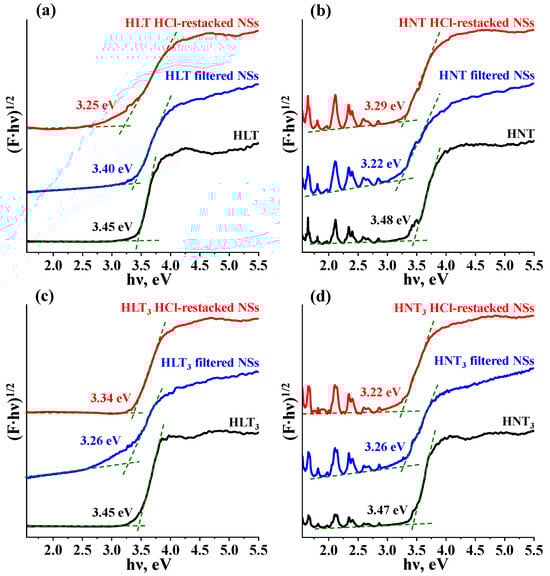 Kubelka–Munk plots for protonated forms and reassembled nanosheets of the titanates HLT (a), HNT (b), HLT3 (c) and HNT3 (d).