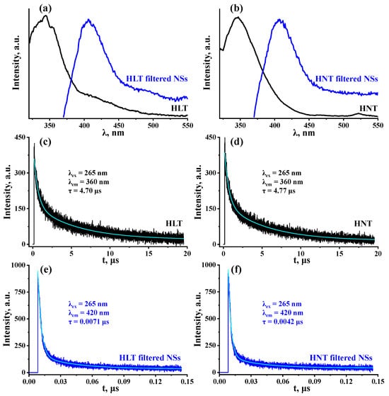 Photoluminescence spectra (a,b) and decay graphs (c–f) for the protonated titanates HLT, HNT and their reassembled nanosheets.