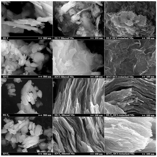 Morphology and the specific surface area of the samples were investigated using SEM and BET methods (Figure 6, Table 1). The initial protonated titanates are seen to represent agglomerates of monolithic lamellar particles with lateral dimensions of 0.5–4 μm and a thickness of 200–600 nm. Their reassembled forms, on the contrary, consist of distorted perovskite layers with irregularly shaped edges, stacked in a relatively large aggregates of micrometer sizes. The reassembled nanosheets of HLT3 and HNT3 demonstrate an evidently greater stacking order than those of HLT and HNT and one can clearly observe individual layers of a nanoscale thickness. The specific surface area of the exfoliated and reassembled titanates reaches 85 m2/g and exceeds that of the precursors (3–10 m2/g) by up to 19 times, which is of high importance for catalytic applications. Moreover, HLT and HNT samples outperform their HLT3 and HNT3 counterparts in the specific surface and the reassembly approach chosen noticeably influences its value: the surface area of HCl-restacked NSs exceeds that of the filtered NSs by ≈1.3 times for HLT (HNT) and ≈3 times for HLT3 (HNT3).