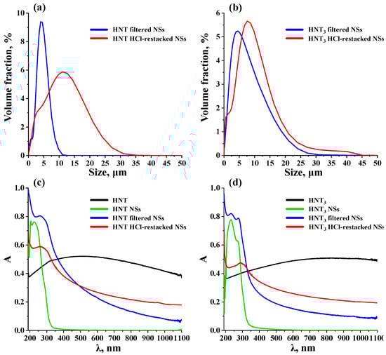 The relationship between prevailing particle sizes of the initial titanates, their pristine and reassembled nanosheets can also be illustrated by characteristic UV-vis spectra of their aqueous suspensions (Figure 7c,d). The initial protonated samples are seen to give non-zero optical density across the entire spectrum, which is caused by intense Mie scattering on relatively large particles. The suspensions of pristine NSs, on the contrary, show narrow overlapping bands only in the middle-ultraviolet region (200–340 nm), representing a superposition of scattering and absorption by the nanoparticles, while optical density at greater wavelengths tends to zero. The spectra of both forms of the reassembled and redispersed nanosheets represent a cross between those of the bulk precursors and pristine NSs: they show expressed maxima in the ultraviolet range and, at the same time, non-zero optical density in the rest of the spectrum. This allows one to deduce that their average particle sizes occupy an intermediate position between those of the protonated titanates and their pristine NSs. Meanwhile, the spectra of the dispersed filtered NSs differ from those of the HCl-restacked ones by clearer peaks in the ultraviolet area and lower optical density in the visible range. This fact, apparently, points to smaller particle sizes of the filtered NSs and is consistent with the results of laser granulometry (Figure 7a,b).