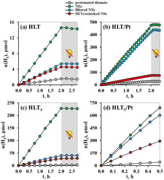 Kinetic curves of photocatalytic hydrogen evolution from 1 mol.% aqueous methanol over the protonated titanates HLT (a,b), HLT3 (c,d) and their nanosheet-based photocatalysts.