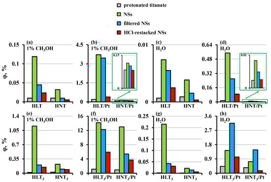 The initial protonated titanates and three forms of their nanosheets—pristine, filtered and HCl-restacked—have been comprehensively investigated as heterogeneous photocatalysts of hydrogen production from 1 mol.% aqueous methanol as well as pure distilled water. Each photocatalyst was tested both in a bare state and after in situ surface decoration with 1% Pt nanoparticles. The latter are known to serve as a cocatalyst suppressing the surface charge carrier recombination and creating new active sites of hydrogen formation, which usually leads to noticeably higher photocatalytic activity of the platinized samples [35]. Kinetic curves of hydrogen evolution obtained are shown in Figure 8 and Figures S4–S8, data on the photocatalytic activity are summarized in Table 2 and comparison of the apparent quantum efficiencies φ is visualized as bar graphs in Figure 9. As one can see, practically all the kinetic curves demonstrate linear behavior that confirms a stable hydrogen production rate throughout the whole experiment time. When the light source is switched off, the curves reach a plateau indicating the absence of the activity in a dark mode.