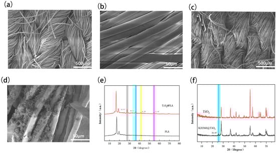 SEM images of fabric samples with different magnifications: (a) PLA original fabric surface (b) PLA original fiber surface (c) TiO2-modified PLA fabric surface (d) TiO2-modified PLA fiber surface (e) XRD images before and after titanium dioxide modification (f) XRD images before and after KH569 modification.
