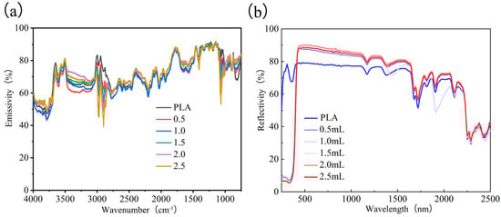 Figure 2a displays the infrared emissivity profiles of PLA fabrics before and after TiO2 treatment. The emissivity images reveal the infrared absorption characteristics of PLA fabrics and the changes induced by varying TiO2 concentrations. The untreated PLA fabric exhibited significant absorption peaks at specific wave numbers. With increasing TiO2 concentration, minor changes in infrared emissivity were observed, likely due to the TiO2 coating altering the fabric’s light scattering and absorption properties. At lower TiO2 treatment amounts, the emissivity curves showed a slight decrease in certain bands compared to untreated PLA. At higher treatment amounts, the changes in emissivity became more pronounced, particularly near 3000 cm−1, where emissivity decreased significantly. These findings suggest that the infrared radiation properties of the fabric are notably influenced when the TiO2 concentration reaches a certain threshold.