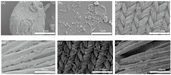 Figure 3e,f present different magnifications and details of the fabric after PDMS treatment, respectively. Figure 3e shows that the fiber surface is relatively rough and covered by a fine coating of PDMS. The PDMS film is highly adhesive, enabling it to bond closely with the fabric. This layer exhibits excellent hydrophobicity, making it suitable as a hydrophobic layer for thermally managed fabrics. The PDMS hydrophobic membrane can form a Janus wettability structure with the TiO2 hydrophilic surface, enabling unidirectional moisture conduction. This structure allows moisture to be transported directionally, facilitating the rapid evaporation of perspiration from the inner layer (in contact with the skin) to the outer layer of the fabric. Importantly, perspiration in the outer layer does not penetrate back into the inner layer, thereby enhancing wearer comfort.