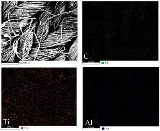 The application of MXene, a two-dimensional layered material, to the PLA fabric surface significantly modifies the fabric’s microstructure and elemental composition. The presence of titanium enhances the material’s functionality, such as improving electrical conductivity and thermal stability. Meanwhile, the homogeneous distribution of carbon suggests that the basic structure of the PLA remains intact.