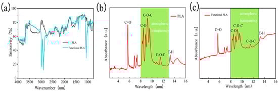 (a) Infrared emission properties of PLA fabrics and functional PLA fabrics (b) PLA fabric IR absorbance (c) Functional PLA fabric IR absorbance.