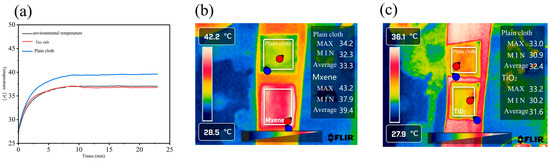 To evaluate the UV resistance of functional polylactic acid (PLA) fabrics, a YG (B) 912E textile UV tester (Wenzhou Da Rong Textile Instrument Co., Ltd., Wenzhou, China) was employed. The fabrics were subjected to natural light exposure for a duration of 10 min, during which they were positioned on an arm to simulate the effects of wear. The surface temperatures of the PLA, TiO2@PLA, and MXene@PLA fabrics were measured and documented using a thermal imaging device. The temperature variations of the fabrics were recorded over a 5-min interval from the initiation of heating under a specified light intensity.