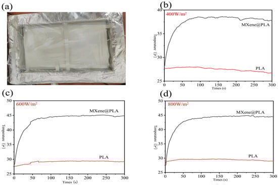 To distinguish the effects of thermal convection from other factors, this experiment was conducted in a foam box covered with plastic wrap, as shown in Figure 7a. Additionally, the temperature differences between PLA and MXene@PLA under varying light intensities were tested, and their heating behavior was discussed, as shown in Figure 7b–d. Over time, the temperature of the PLA fabric slightly decreased, while the MXene@PLA fabric experienced a significant temperature increase within the first 50 s, rising from 28 °C to 38 °C and maintaining a higher temperature level. Under a light intensity of 600 W/m2, the surface temperature of the polylactic acid fabric slightly increased, while the MXene@PLA fabric rapidly heated up in the initial stage and stabilized at approximately 45 °C. Therefore, the temperature difference exceeded 15 °C compared to the polylactic acid fabric. At an intensity of 800 W/m2, both MXene@PLA and polylactic acid fabrics exhibited a noticeable increase in temperature. However, after 150 s, the temperature of the PLA fabric dropped significantly, while the MXene@PLA fabric maintained a higher temperature.