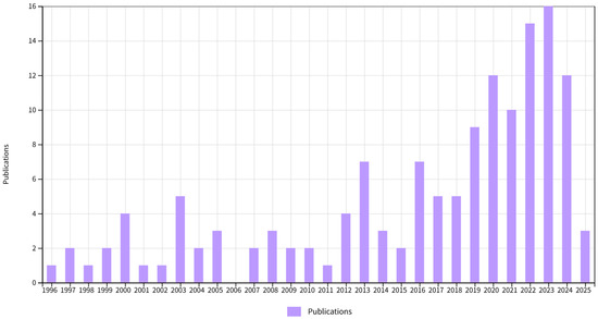 Figure 1. The evolution of publication trends in the unconventional stoichiometric crystals field over time, according to Web of Science data.
