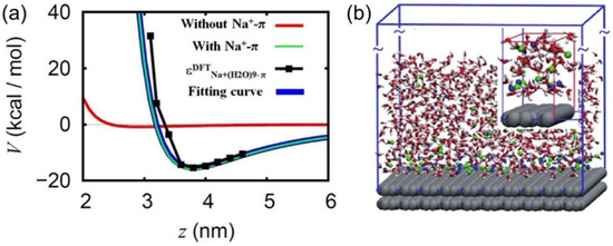 Graphene-based materials feature π electron-rich hexagonal carbon ring structures [27]. Cation–π interaction—the non-covalent interaction between a cation and a π electron-rich carbon-based structure, which was first observed in the 1980s—has a significant impact on ion accumulation behavior on π electron-rich surfaces [28]. Both experimental and theoretical studies have demonstrated that cation–π interactions play important roles in various systems, such as controlling the structures and functions of microscale and nanoscale materials, macromolecules, and proteins [29,30,31,32,33,34]. In aqueous media, Dougherty noted that the cation−π interaction between a cation and a π electron-rich carbon-based structure is seriously weakened by aqueous solution due to cations’ hydrating effects [35]. However, recent theoretical and experimental studies have confirmed that such interactions exert statistical influence on interfacial dynamics, significantly influencing the behaviors and movement of hydrated cations as well as the reactivities and physical characteristics of carbon-based materials or biological macromolecules.