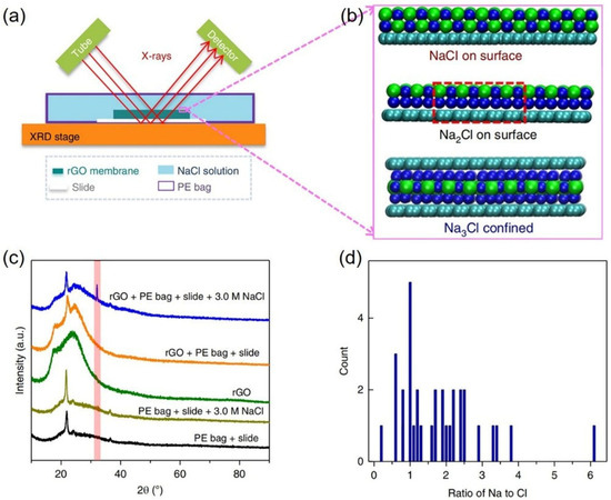 Figure 3. Two-dimensional Na-Cl crystals from salt solutions far below the saturated concentration: (a) schematic picture of experimental setup; (b) structure snapshots from DFT calculations of Na+ and Cl on a graphene surface and between two graphene sheets; (c) XRD pattern of rGOMs immersed in the 3.0 M NaCl solution sealed in a PE bag with a glass slide (blue line) together with the XRD patterns of four control systems; (d) ratios of Na to Cl in the 2D crystal structures as determined by EDS–TEM. a.u.—arbitrary units. Adapted with permission from Ref. [19]. Copyright 2025 Springer Nature.