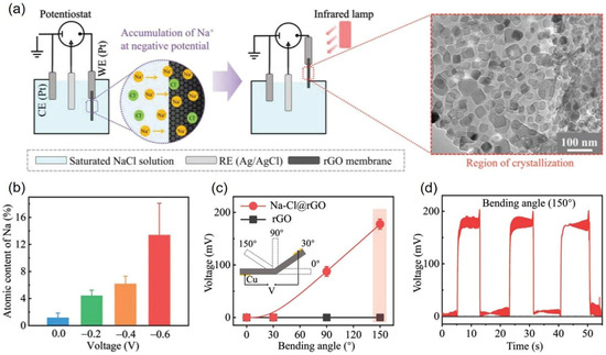 Figure 4. Two-dimensional Na-Cl crystals in the rGO membranes (Na-Cl@rGO) by applying a negative potential: (a) schematic of synthesis of 2D Na-Cl crystals; (b) atomic content of Na in Na-Cl@rGO measured by EDS-SEM; (c) piezoelectric behavior of rGO, Na-Cl@rGO membranes bent at angles of 30°, 90°, and 150°, respectively; (d) voltage responses from rGO (black line) and Na-Cl@rGO membranes (red line). Adapted with permission from Ref. [46]. Copyright 2025 John Wiley and Sons.