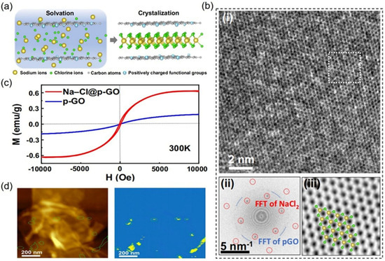 Figure 5. Two-dimensional NaCl2 crystal with sandwiched structure in GOMs with p-GO: (a) schematic design of a p-GO membrane with a positively charged surface prepared by functionalizing GO with polyethyleneimine (PEI); (b) high-resolution TEM (HR-TEM) of a NaCl2 single crystal; (c) magnetization hysteresis loops of Na-Cl@p-GO membranes and p-GO membranes measured at room temperature; (d) atomic force microscopy (AFM) images (left) and MFM images (right) of Na–Cl@p-GO membrane. Reprinted with permission from Ref. [21]. Copyright 2025 Springer Nature.