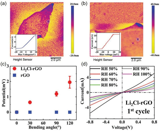 Figure 6. Two-dimensional metallic Li-Cl crystals from salt solution below the saturated concentration: AFM images and I–V characteristics of (a) the pure dried graphene sheets and (b) dried graphene sheets with Li and Cl on Au-coated quartz substrates; (c) piezoelectricity-like property of the dried Li2Cl-rGO membrane; (d) LSV curves of dried Li2Cl-rGO for the first cycle for humidity sensing. Adapted with permission from Ref. [22]. Copyright 2025 John Wiley and Sons.