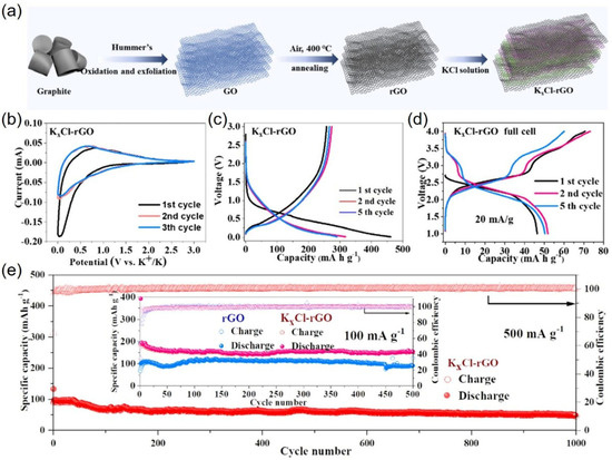 Figure 7. (a) Schematic of the synthesis process of KxCl-rGO electrode; (b) CV curves of KxCl-rGO as PIB anodes in half cells at a scan rate of 0.1 mV s−1; (c) galvanostatic discharge and charge profiles for the first five cycles of the KxCl-rGO electrode at a current density of 20 mA g−1; (d) galvanostatic charge–discharge curves of the KxCl-rGO K-ion full batteries at a current density of 20 mA g−1; (e) cycling performance and corresponding Coulombic efficiency of freestanding KxCl-rGO electrode at 500 mA g−1. Adapted with permission from Ref. [26]. Copyright 2025 Elsevier.