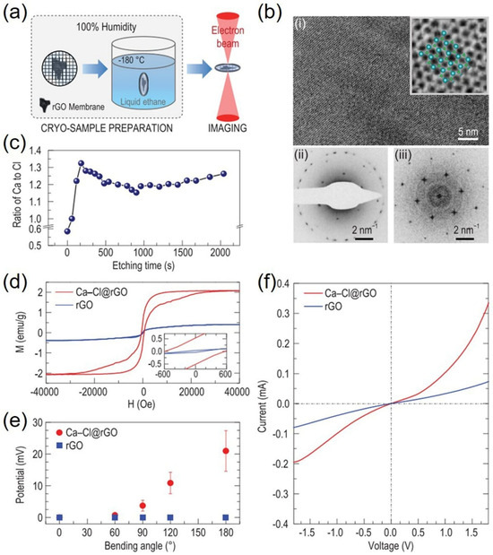 Figure 8. Two-dimensional Ca-Cl crystals from salt solution below the saturated concentration: (a) schematic drawings of the sample preparation processes; (b) cryo-EM image of the Ca-Cl crystals in the ultrathin rGOM; (c) atomic ratio of Ca to Cl as a function of the etching time; (d) room-temperature ferromagnetism of the dried Ca-Cl@rGO membrane; (e) piezoelectricity-like property of the dried Ca-Cl@rGO membrane under ambient conditions; (f) heterojunction behavior of the dried Ca-Cl@rGO membrane. Reprinted with permission from Ref. [20]. Copyright 2025 Oxford University Press.