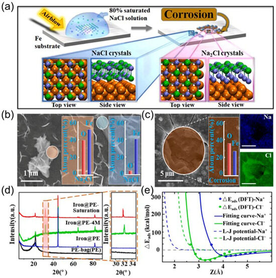 Figure 9. SEM-EDS images of Na–Cl crystals with different concentrations of NaCl solutions on the surface of the Fe sample: (a) schematic diagram of the experimental procedure for growing Na2Cl crystals on metal; (b,c) SEM image of the corrosion condition of the crystal on the metal surface; (d) XRD pattern of iron sample immersed in 4.0 M and saturated with NaCl solution; (e) density functional theory (DFT) adsorption energies between Na+–(H2O)4/Cl–(H2O)4 (dots) and iron. Adapted with permission from Ref. [68]. Copyright 2025 Elsevier.
