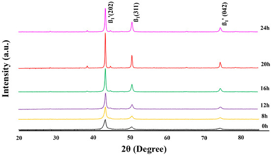 Figure 2 shows the XRD analysis results of the reference alloy powders produced with different mechanical alloying times. The two main diffraction peaks observed at room temperature belong to the martensite phase, and these main diffraction peaks can be attributed to peak groups containing the β1’ martensite structure. These structures correspond to the β1’ (202) and β1 (311) peaks at 42.647° and 49.535°, respectively. In addition, a low intensity β1’ (042) peak corresponding to an angle of 75.824° is observed. The most intense reflection among the planes is the (202) plane at an angle of 42.647°. For the CuAlMnFe alloys, as the mechanical alloying time increased up to 20 h, the intensities of the diffraction peaks in the XRD patterns increased. It was observed that after 20 h of mixing, during the mixing at 24 h, the peak intensities decreased. At 20 h of mixing, the X-ray diffractometer measurements revealed that the sharpness of the peaks and intensity of the peaks increased. It was determined that the crystal martensitic phases necessary for the copper-based alloy samples to exhibit SME have formed. Thus, it can be stated that the alloy sample with the most intense martensitic peaks, which underwent 20 h of mechanical mixing, is closer to the martensitic phase transformation mechanism.