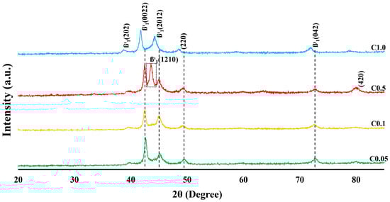 Figure 3 displays the XRD patterns of the CuAlMnFe alloys with varying CeO2 content, following quenching. We know that the β1’ martensite phase is essential for the shape memory characteristics, and to achieve this phase in the alloy, quenching is necessary [33]. At room temperature, the (202), (0022), (1210), (2012), and (042) planes corresponding to the β1’ martensite phase were observed at 42.40°, 44.95°, 49.18°, and 72.48°, respectively. On the other hand, the CeO2 (220) and (420) planes were detected at 50° and 81.74°, respectively. It can be observed that the addition of CeO2 promotes the dissolution of copper and enhances the formation of the martensitic phase. In the CuAlMnFe alloy, the formation of martensitic phases is observed at different diffraction angles, indicating the development of phases. At CeO2 concentrations below 0.5 wt.%, a low-intensity martensite phase was present. However, the high intensity β1’ parent phase appeared in the alloy when the CeO2 content was increased to 0.5 wt.%. The peak intensity of β1’ (0022) and β1’ (2012) changed with the addition of a small amount of CeO2. Specifically, the C0.5 sample caused a notable increase in the peak intensity of β1’ (0022) while simultaneously reducing the peak intensity of β1’ (1210). Further increasing the CeO2 content (1.0 wt.%) caused the β1’ (1210) to disappear. Also, it was not observed that the peak of β1’ (1210) with added CeO2 (0.05 wt.% and 0.1 wt.%). As it is known, with the martensitic transformation temperatures of Cu-based alloys increasing, the martensite progressively becomes the dominant phase, and the alloys may consist entirely of martensite [34]. The emergence of phase (β1’ (1210)) is likely to significantly impact the mechanical properties of the CuAlMnFe alloys. Furthermore, CeO2 phases in the C0.5 sample were detected in the XRD analysis. This could be attributed to the high concentration of added CeO2 or the possibility that CeO2 was solved within the matrix [18]. The formation of (0022) and (1210) peaks due to the addition of CeO2 to the CuAlMnFe alloy composition can be explained by the infiltration of CeO2 particles into the alloy matrix phase. The increase in the peak intensity at 44.95° with increasing CeO2 content could be attributed to the increased solid solubility of the CeO2 powder. Also, martensitic phases are distinctly identified in the XRD patterns of the sintered alloy samples. It could be associated that the martensitic phase has been fully completed [35]. In addition, we could mention that the completion of the α + β1′ transition of the ordered β1 phase or its partial retention without significant changes was possible. Despite the CuAlMnFe content remaining unchanged, the diffraction peaks of martensite have become much more distinct with the increasing CeO2 content (0.5 wt.%), which is attributed to the rise in martensitic transformation temperature. The martensitic transformation temperatures of Cu-based alloys could be explained by the increasing dominance of martensite and the transformation of the alloys into a single martensitic structure [36]. Consequently, with CeO2 content increases, the diffraction peaks of martensite become much more distinct, and the high intensity of X-ray peaks indicates that primarily martensite was present in the C0.5 sample.
