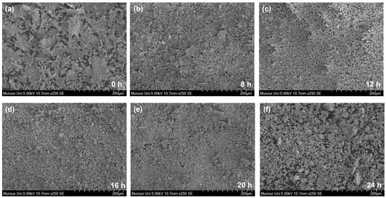 SEM images of CuAlMnFe SMA samples prepared at different mechanical mixing speeds; (a) 0 h, (b) 8 h, (c) 12 h, (d) 16 h, (e) 20 h, and (f) 24 h, respectively.