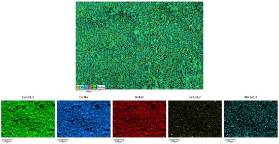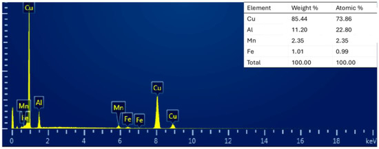 Figure 5 shows the mapping images of the CuAlMnFe alloy mixed mechanically for 20 h. The morphology, size, and distribution of particles, as well as the overall homogeneity of the mixed powders, were observed. As observed in the mapping images, the main phase of Cu was green, while Al, Fe, and Mn powders in the Cu matrix form a rich layer that reacts with Cu to create the alloy. The EDS elemental composition analysis of specific areas of CuAlMnFe alloy is shown in Figure 6. It could be concluded that the sample exhibits copper-rich characteristics and that Al, Mn, and Fe particles were distributed within the matrix phase. It has been found that verifying the CuAlMnFe alloy and assessing the elemental homogeneity after mechanical mixing was necessary. It could be said that deviations from compositions would indicate specific microstructural features.