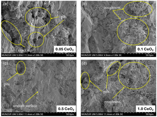 On the other hand, compared to the other alloys, the C0.05 alloy exhibits a much greater average wear rate of 1.9 × 10−5 mm3/(Nm). When the CeO2 content exceeds 0.5 wt.%, the alloy’s COF increases noticeably. This is not the same as how alloys with CeO2 content vary in hardness. Additionally, it is observed that when the CeO2 concentration hits 1.0 wt.%, the wear profile changes. It could be attributed to the 0.5 wt.% CeO2 alloy exhibiting wear characteristics and a hardness different from the 1.0 wt.% alloy, despite similar surface flaws. Furthermore, the development and expansion of cracks were linked to the abrasion process. The wear could be decreased by any element that inhibited the emergence of cracks. Since a strong link has been formed between the reinforcement and the matrix, as was indicated in the preceding sections, these particles may be able to inhibit the formation of cracks [42]. These findings lead us to the conclusion that the CuAlMnFe alloy’s wear resistance was enhanced by the addition of CeO2. The CuAlMnFe/CeO2 was an excellent contender for enhancing the lubrication because of its satisfying wear resistance. On the other hand, hard precipitates could bear a portion of the applied load, resist the cutting action of abrasive particles and inhibit the propagation of cracks, which was crucial in preventing delamination wear. The presence of these stable CeO2 phases could also reduce the tendency for material adhesion between the sliding surfaces.