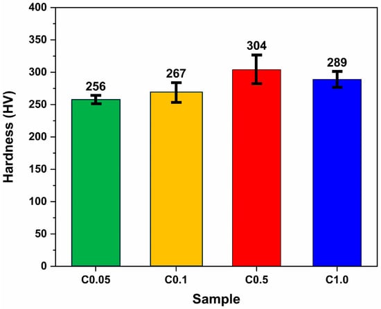 Figure 8 illustrates the relationship between CeO2 content and the corresponding changes in Vickers hardness for CuAlMnFe alloys. Peak hardness values of 256 HV, 267 HV, 304 HV, and 289 HV were observed for CuAlMnFe alloys that include CeO2, respectively. As the quantity of CeO2 particles increased, the CuAlMnFe alloy’s microhardness tended to grow and then decrease. It peaked at 0.5 wt.%. The CeO2 concentration then began to decline at 1.0 wt.%. The hardness of the alloy is significantly influenced by the quantity of CeO2 present; hence, variations in the structure of the CuAlMnFe alloy result in notable variations in performance. An increase in hardness is observed with increasing CeO2 content below 0.1 wt.%. A nearly 1.2-fold increase in hardness is achieved with CeO2 containing 0.5 wt.% CeO2, which is substantially higher than values for 0.05 wt.%. CeO2 content. CuAlMnFe alloy, which includes 0.5 wt.%. CeO2 reached a peak hardness value of 304 HV. However, as the CeO2 concentration rises to 1.0 wt.%, the C1.0 alloy’s hardness decreases to 289 HV. The rise in hardness of the CuAlMnFe alloys is likely due to the refined microstructure and the uniform dispersion of CeO2 precipitates, which contribute significantly to strengthening. The rich intermetallic compounds may form in sample C0.5 [39].