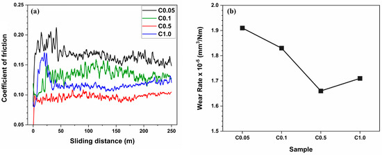 The friction coefficients (COF) (a) and wear rate (b) of CeO2-including CuAlMnFe composite alloys were illustrated in Figure 9, respectively. Significant variations in frictional behavior were shown by comparing the friction coefficients following wear testing. The COF was affected by numerous factors, including the surface condition and the bulk mechanical properties of the contacting surfaces. The lower portion of the alloy is denser, while the higher portion is looser with occasional microcracks and micropores, which accounts for the fluctuation at the beginning of the curves. Because of the complicated working conditions during the early friction stage, the friction coefficient varies greatly [50]. It is evident that in all samples, the loading step caused the COF to rise in the first distances before beginning to fluctuate within ranges. The COF is significantly reduced by CeO2 addition and decreases steadily with increasing CeO2 content. Eventually, the CuAlMnFe alloys’ COF stabilizes and ceases to fluctuate, indicating that wear-through has not occurred. Between 0 and 50 m, the coefficient of friction first rises to 0.21, and between 50 and 250 m, it tends to settle at around 0.15. Also, the first “run in” step is the cause of the increase in the coefficient from 0 to 50 m [12]. The CeO2 addition considerably lowers the COF; the C0.5 sample has a friction coefficient of roughly 0.11, which is much less than that of the other samples. The findings indicate that when 0.5 wt.%. CeO2 is added, the alloy’s COF decreases by over 30% when compared to the 0.05 wt.%. CeO2 sample. It is noted that the COF has once again risen with the addition of 1.0 wt.%. CeO2.