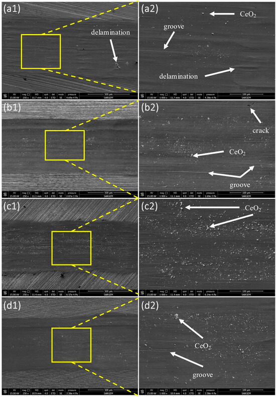SEM images of worn surfaces at 25 °C: (a1,a2) C0.05, (b1,b2) C0.1, (c1,c2) C0.5, and (d1,d2) C1.0.