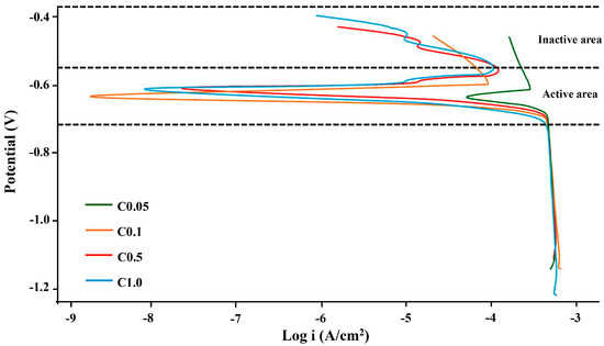 The similarly scaled potentiodynamic polarization curves of Cu-based alloy specimens in a 3.5 wt.% NaCl solution at room temperature is shown in Figure 11. Electrochemical polarization provides an appropriate description of the relationship between potential (E) and current (i). A common feature of E–i behavior for alloys was the comparable form of the polarization curves with cathodic and anodic branches for both alloys [58]. Tafel’s law, which was declared as typical active metal dissolving behavior as the current density rose with an increase in the applied anodic over-voltage, was followed by the anodic branches. Additionally, it could be indicated that the CeO2-containing alloys showed a considerable drop in anodic current density [59]. The electrochemical parameters, including corrosion potential (Ecorr) and corrosion current density (icorr), were assessed from the polarization curves using Tafel analysis to compare the corrosion resistance for alloys, and Table 2 displays the equivalent findings by Tafel fittings. Figure 11 displays the polarization curves of the alloy samples, illustrating differences in their electrochemical response and corrosion resistance. As seen, Cu-based alloy samples had a reduced corrosion current density and a positively shifted corrosion potential when the CeO2 concentration in the alloy increased. The corrosion potential of the alloys was recognized to be related to their corrosion tendency. If the alloy had a lower corrosion potential, it was more easily corroded. Also, the corrosion rate, which was proportional to the corrosion current density, further affected the degree of corrosion. [60,61]. When the Ecorr and icorr for the described polarization curves were calculated, it became clear that the addition of 0.05 wt.%. CeO2 to the Cu-based alloy resulted in a considerable shift in the corrosion potential (to +) and current (to −). The anodic and cathodic branches of the C0.1, C0.5, and C1.0 alloy specimens had comparable shapes. The anodic polarization curves of the above alloys were significantly different from the potentiodynamic polarization curves examined on C0.05. It could be attributed that activation polarization was in charge of the cathodic process, and the passivation zones were almost parallel to the potential axis in the anode polarization region [62].