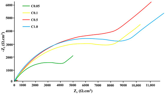 The CeO2, including CuAlMnFe alloys’ electrochemical corrosion behavior, was assessed using EIS testing in a 3.5 wt.%. NaCl solution at room temperature to better assess the impact of CeO2 addition. The corrosion products’ electrical resistance reflects the substrate’s protection. By employing the frequency response of the surface circuit, electrochemical impedance testing can non-destructively identify the surface resistance. In Figure 12, Nyquist plots of the Cu-based alloys with CeO2 addition were displayed. It demonstrates that the capacitive arc in the high frequency area was present in the impedance curves for C0.05, C0.1, C0.5, and C1.0 samples. It was clear that the radius of the impedance spectrum increased as the CeO2 concentration increased. The C0.1, C0.5, and C1.0 alloys’ radius was also greater than the C0.05 alloy’s, indicating that the passive layer after 0.05 wt.% CeO2-containing alloys’ surface had thickened. This indicates improved corrosion resistance and an increase in the impedance of the corrosion products. Otherwise, the corrosion surface inhomogeneity was the reason why the capacitance loop was not an exact semicircle. It was linked to a charge transfer process in the electronic double layer that developed at the junction of the corrosion solution and the Cu-based alloy surface [28].