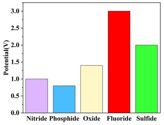 Transition metal oxides, fluorides, sulfides, phosphides, and nitrides can all achieve lithium storage through conversion reactions. However, with the exception of fluorides, these materials exhibit relatively low potential ranges, as shown in Figure 2, making them unsuitable for use as cathode materials [51]. The reason fluorides have emerged as key candidate cathode materials for high-capacity LIBs primarily lies in their unique chemical properties. The F− ions in fluorides possess strong electronegativity, enabling them to form ionic bonds with transition metals M to create MFn. Due to the high chemical bond energy between M-F, the discharge plateau of MFn can be elevated into the operating voltage range of cathode materials, thereby exhibiting excellent electrochemical performance in LIBs. These characteristics make transition metal fluorides one of the most promising candidate cathode materials for high-capacity LIBs [51,52].