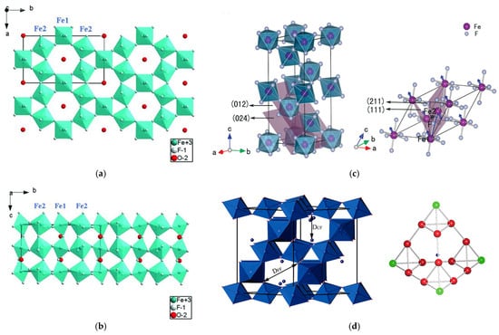 (2) Rhenium trioxide-type Phase (ReO3-FeF3) adopts a distorted ReO3-type trigonal structure (space group R3−m) [63,64]. As illustrated in (Figure 4c) [62], its crystal architecture resembles the ABX3 perovskite type, featuring a three-dimensional tunnel structure formed by corner-sharing FeF6/2octahedra. In this configuration, Fe3+ ions are stably located in the (102) planes of the rhombohedral structure and Li+ ions undergo intercalation/deintercalation through the A-site vacancies in the (204) planes [65]. This distinctive structural arrangement endows ReO3-FeF3 with promising potential for lithium-ion battery applications.