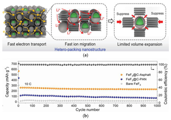 (a) Schematic illustration of electron/ion transport in hetero-packing nanostructured FeF3@C-Asphalt nanocomposites, and (b) long-term cycling stability of FeF3@C-Asphalt, FeF3@C-PAN, and bare FeF3 samples at 10C. Reproduced with permission. Copyright 2023, Advanced Energy Materials [16].