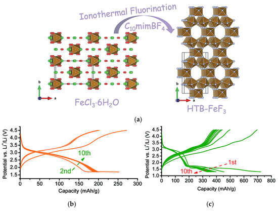 (a) Scheme of ionothermal fluorination of FeCl3·6H2O to form dehydrated HTB-FeF3 in C10mimBF4 reaction medium. Galvanostatic charge/discharge curves of HTB-FeF3 in a voltage range of 1.7–4.5 V, and (b) after electrochemical activation by the initial conversion reaction, and (c) as conversion cathode between 1.3 and 4.5 V. Reproduced with permission. Copyright 2013, American Chemical Society [12].