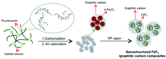 - Kim, T.; Jae, W.J.; Kim, H.; Park, M.; Han, J.M.; Kim, J. A cathode material for lithium-ion batteries based on graphitized carbon-wrapped FeF nanoparticles prepared by facile polymerization. J. Mater. Chem. A 2016, 4, 14857–14864. [Google Scholar] [CrossRef]