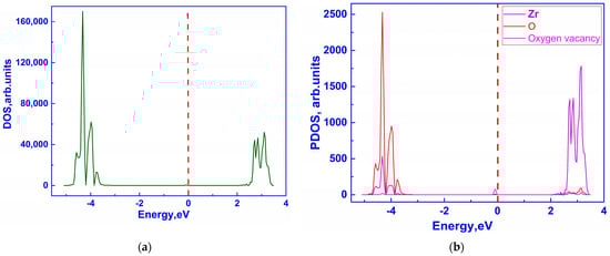 As shown in Figure 2, in pristine ZrO2, the valence band is primarily composed of oxygen 2p orbitals, with a maximum around −4.5 eV, while the conduction band starts above the Fermi level and includes contributions from Zr 4d states. Upon the creation of an oxygen vacancy, an additional narrow localized state appears near the bottom of the conduction band, associated with the remaining paired electron.