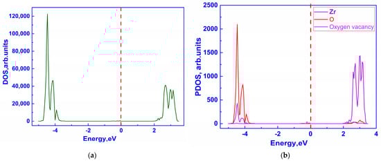 Figure 7 presents the total and partial density of electronic states (DOS and PDOS) for a zirconia system containing three oxygen vacancies and three magnesium atoms. The total DOS shows a characteristic separation between the valence and conduction bands with a wide band gap. As seen in the PDOS, the contribution from oxygen vacancies forms a clearly defined narrow state located near the bottom edge of the conduction band, approximately 5.5–6.0 eV above the Fermi level.