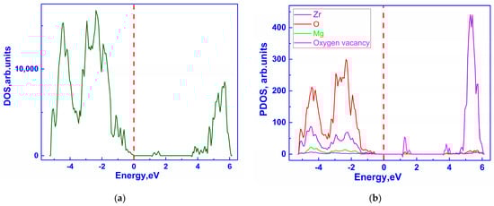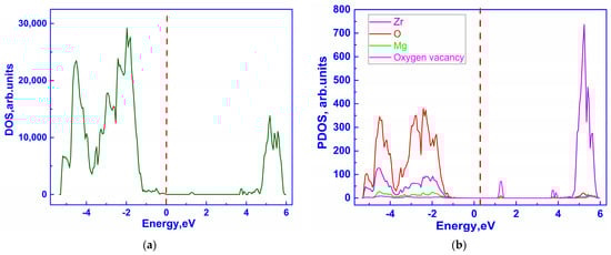 Figure 5 presents the total and partial density of states (DOS and PDOS) for a zirconia structure containing one magnesium substitutional atom and one oxygen vacancy. The upper part of the valence band is primarily formed by oxygen 2p electrons, while the conduction band is mainly composed of zirconium 4d electrons. As shown in the PDOS, magnesium contributes minimally to the electronic structure of the system, which is consistent with its Mg2+ electronic configuration and the absence of unoccupied d-states.