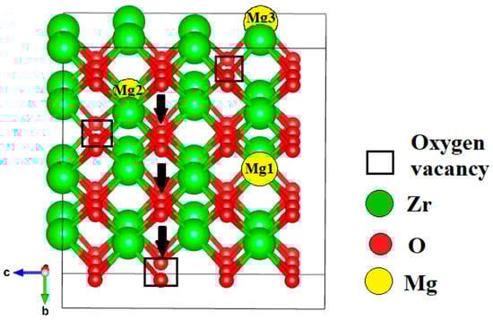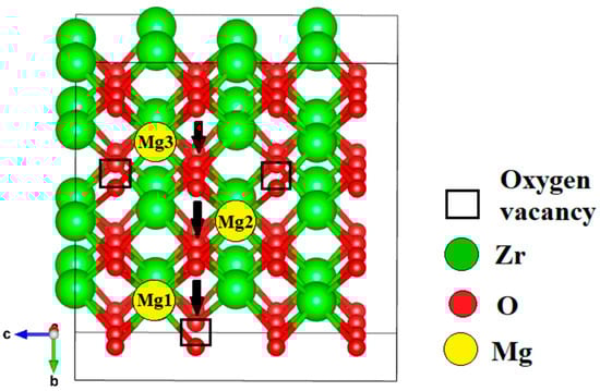 The atomic configurations corresponding to Figure 5, Figure 6 and Figure 7, indicating the removed oxygen atoms and the positions of Zr atoms substituted by Mg, are illustrated in Figure 8.